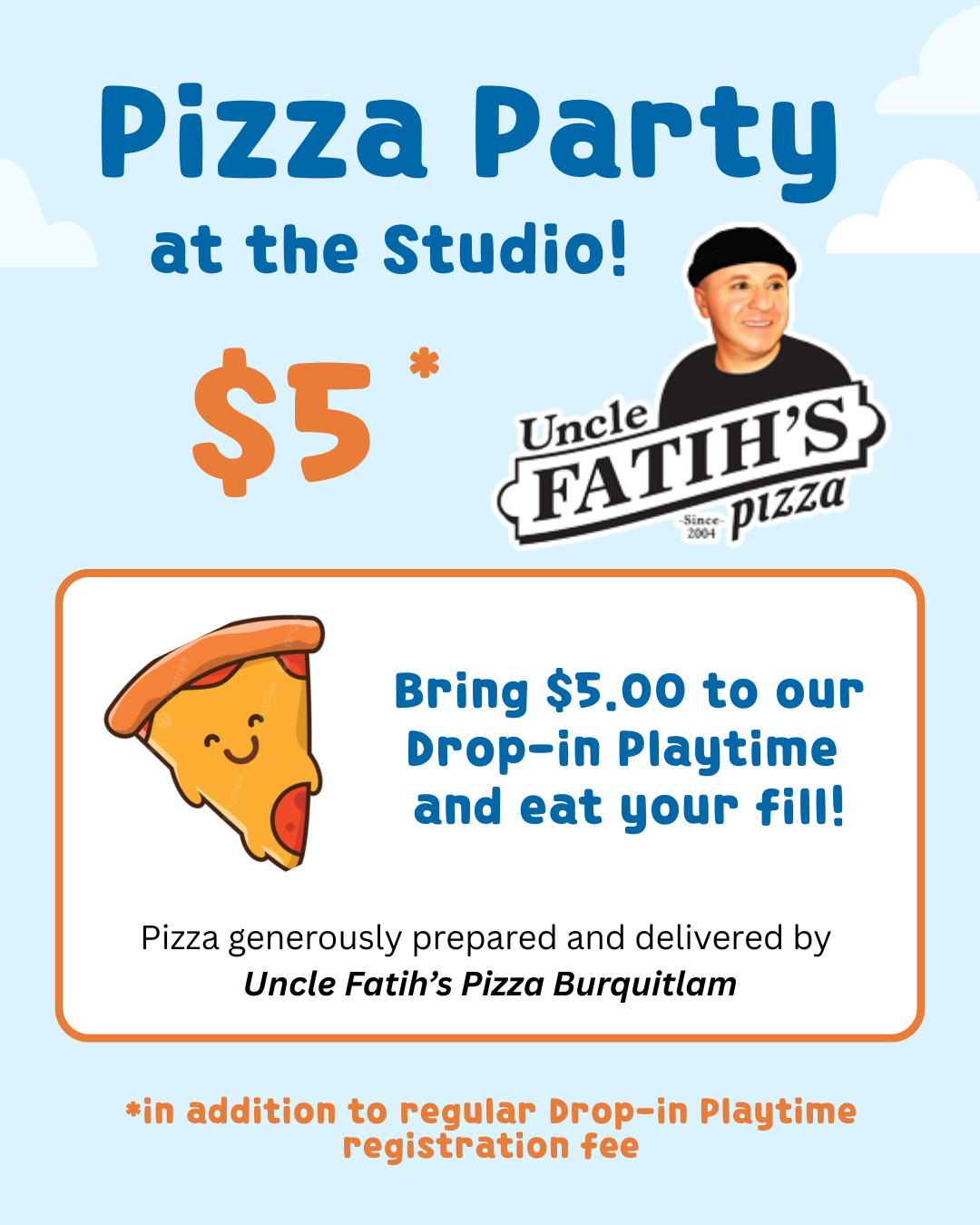 Join us for Drop-in Playtime between 11:30am and 2:30pm (at our regular drop-in rate of $15) and enjoy freshly delivered pizza for an additional $5.00!